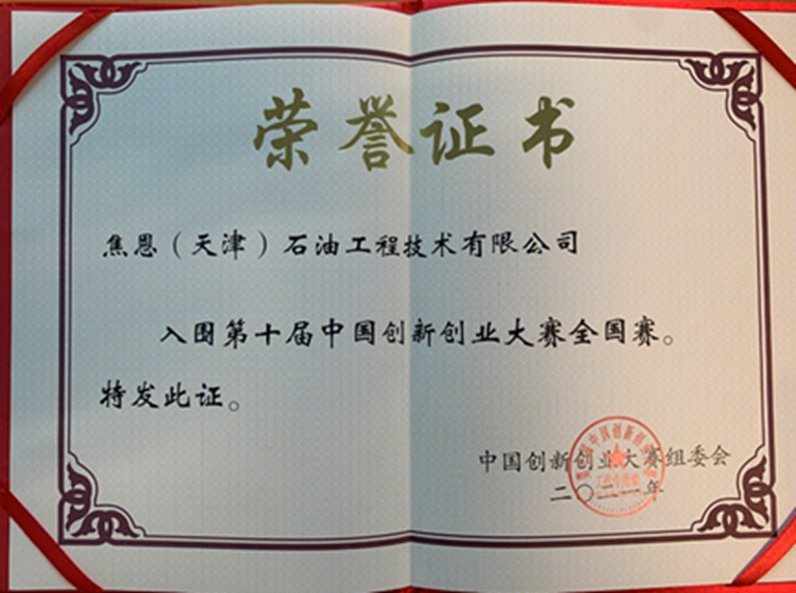 10月20日,焦恩(天津)石油工程技术有限公司的参赛项目“焦恩模式”在武汉举办的第十届中国创新创业大赛全国赛中获优秀奖,这是公司在获得中国创新创业大赛天津赛区新能源领域二等奖后,又一辉煌的成果,是公司“科技引领、高效创新”经营理念获得认可的证明。