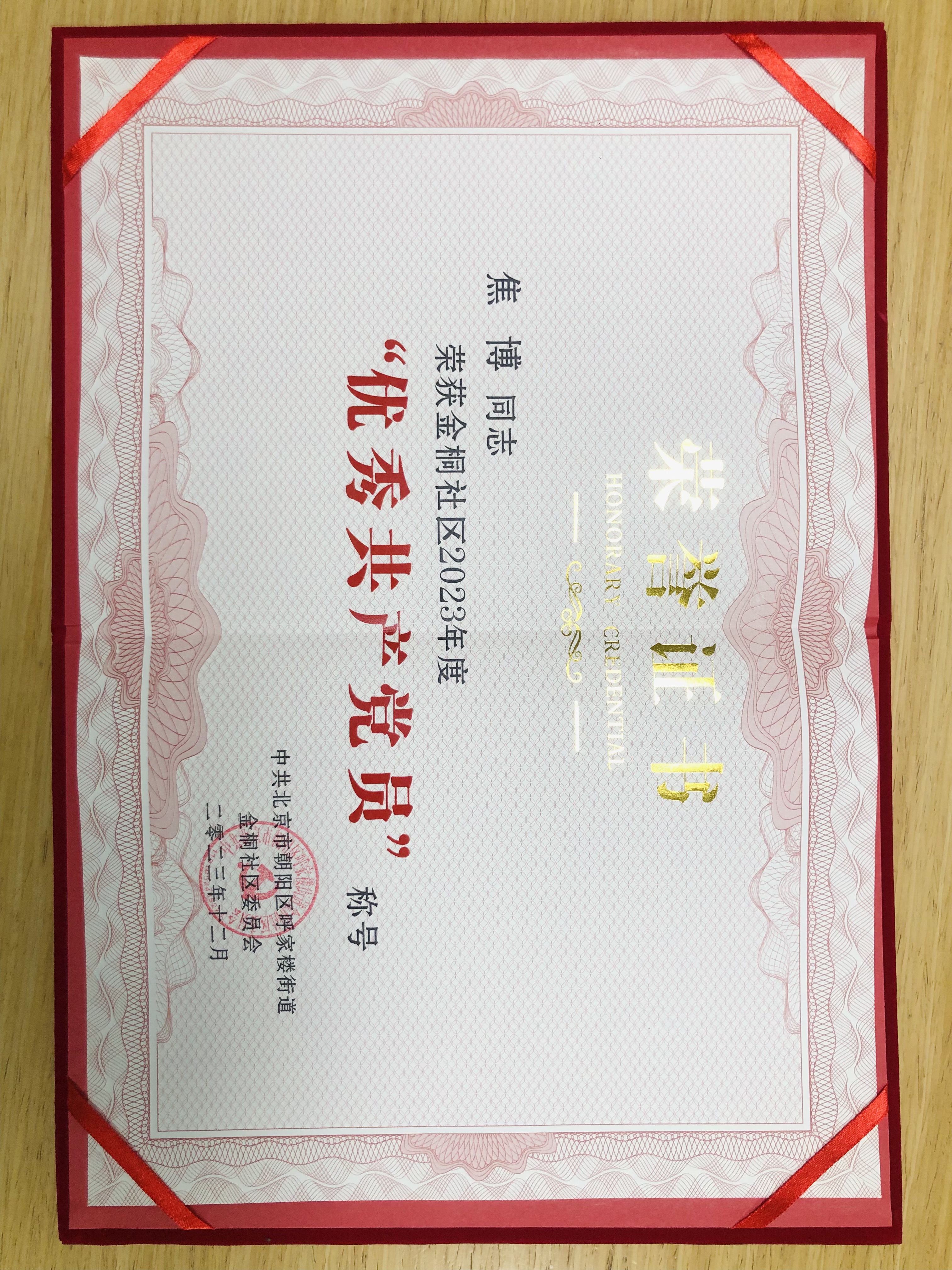 日前,焦恩能源董事长焦博同志荣获中共北京市朝阳区呼家楼街道金桐社区委员会授予的